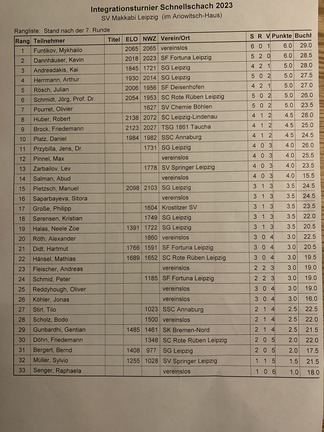 Ich wollte ganz vorne mitspielen und startete vielsprechend. Nach einem Remis gegen Robert Huber (SC Leipzig-Lindenau, DWZ 2072) hatte ich nach 3 Runden bereits 2,5 Punkte auf dem Konto. Leider verpasste ich in Runde 4 gegen Kai Andreadakis (SG Leipzig, DWZ 1721) das Gegenspiel und übersah dann auch noch taktisch den Verlust meiner Dame. Nach 2 weiteren Siegen verhinderte die Niederlage in der Schlussrunde gegen Julian Rösch (SF Deisenhofen, DWZ 1956) meinen Sprung aufs Treppchen. So landete ich mit 4,5 Punkten aus 7 Runden auf dem 10. Platz und sahnte damit immerhin noch den letzten Schoko-Adventskalender ab.