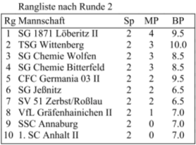 Nach der knappen Niederlage am ersten Spieltag gegen Chemie Wolfen wollten wir nun gegen die SG Chemie Bitterfeld die ersten Punkte holen. Verzichten mussten wir für dieses Unterfangen auf Michael und HaJö, der parallel an der Sächsischen Senioren-Einzelmeisterschaft in Dresden teilnahm. Zudem half Evi in der Zweiten aus. In die Mannschaft rotierten Silke, Fabian und Greini. Greini neutralisierte den Anzugsvorteil und die 400 DWZ-Übergewicht seines Gegners aus der Eröffnung heraus. Auf das Endspiel wurde verzichtet. Eine tolle Leistung von Greini wird mit einem halben Zähler belohnt.