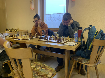 Der 2:3-Zwischenstand passte durchaus in unseren Plan, da nur noch unsere Vorderachse spielte. Doch leider sah es an den vorderen Brettern nicht so rosig aus wie sonst. Die vielsversprechendste Stellung hatte noch HaJö, der alles probierte, sich im Schwerfigurenendspiel aber doch mit der Punkteteilung begüngen musste. Auch bei Dirk war kein Sieg in Sicht. Mit Minusqualität, aber 3 gegen 2 Bauern kämpfte Dirk ums Unentschieden. Mit seinem Springer konnte er tatsächlich eine Art Festung aufbauen und dem gegnerischen Turm Parolie bieten. Das Remis war hart erkämpft. Bei Frank musste nun ein Sieg her, um noch einen Mannschaftszähler zu holen. Franks Stellung war schlecht, aber immerhin kompliziert und bot Potenzial zum Fehlgreifen. Leider war Franks Gegner zu abgezockt, umschiffte sämtliche Fallstricke und brachte die Partie nach Hause. Da war nix zu machen.