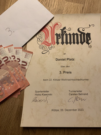 Nach Weihnachten kommt Silvester, so auch beim Schach. Also nahm ich nur einen Tag nach dem Klötzer Weihnachtsturnier am 1. Uwe-Attig-Silvesterblitzturnier teil. Das Blitzturnier (5min+0) wurde in Gedenken an den zu früh verstorbenen Uwe Attig umbenannt und in 4 Vorrundengruppen und einer darauffolgenden Finalrunde durchgeführt. Für mich lief es genauso gut wie am Vortag beim Schnellschach. In meiner Vorrundengruppe gewann ich 7 Partien, u.a. gegen Sven Römling (SG Leipzig, DWZ 2228), remisierte gegen Manuel Pietzsch (SG Leipzig, DWZ 2067) und verlor nur 2 Partien. Das genügte, um als Dritter der Vorrundengruppe in die Finalrunde A einzuziehen.